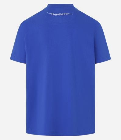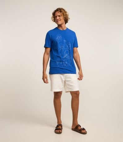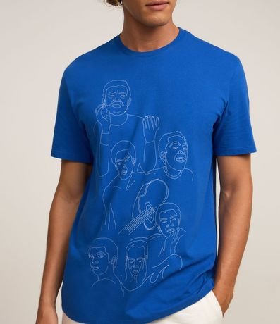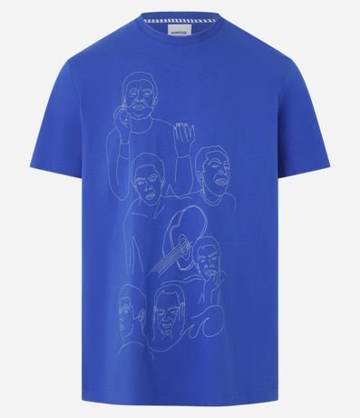 Camiseta manga curta confeccionada em algodão mais sustentável. A peça tem estampa de contorno de figuras do cantor Gilberto Gil e violão.