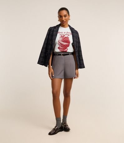 Ref: Camiseta t-shirt de mangas curtas, confeccionada em algodão, com gola redonda. Peça tem estampa de morando com lettering "Have a Berry Nice Day! Take a Bite".