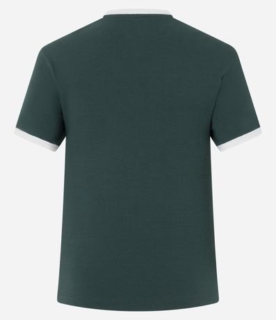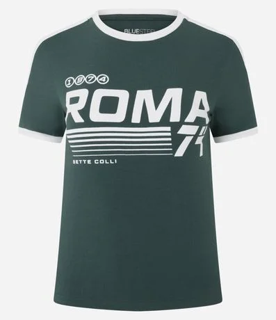 Camiseta feminina confeccionada em algodão mais sustentável através de boas práticas ambientais. Possui gola redonda, manga curta, estampa lettering Roma e detalhes contrastantes.