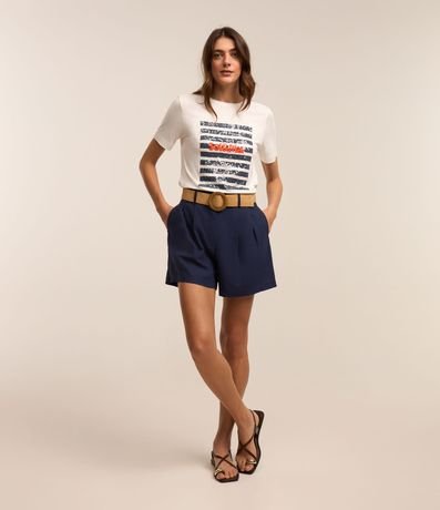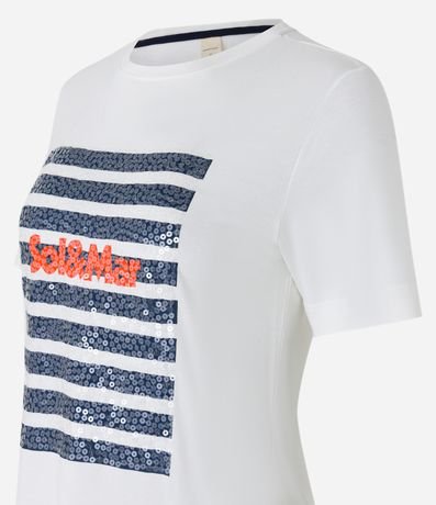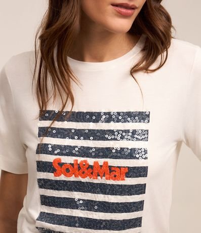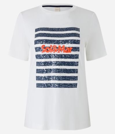Ref: Camiseta masculina, confeccionada em viscose, com gola redonda, mangas curtas e estampa listras sol e mar em paetê.