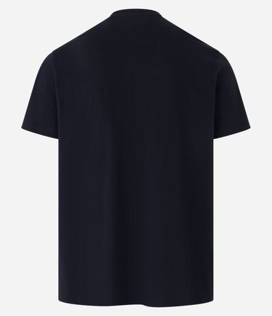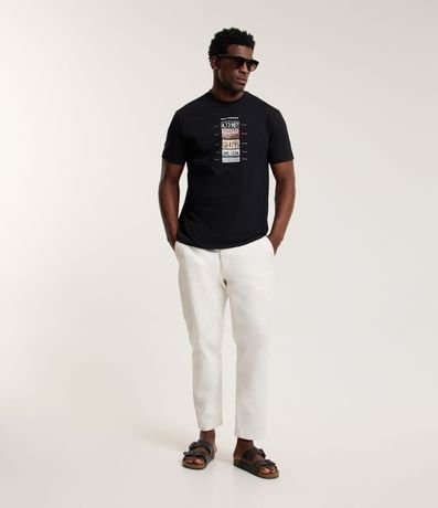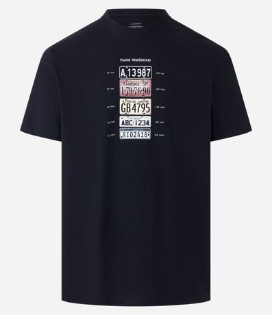 Camiseta masculina, confeccionada em algodão, com gola redonda, mangas curtas e estampa placas de carro.