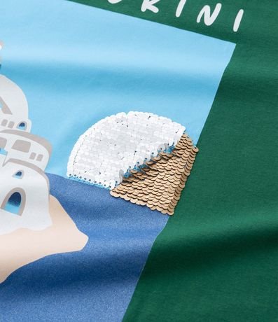 Ref: Camiseta confeccionada em malha de algodão BCI. A t-shirt tem gola redonda, mangas curtas, estampa de paisagem "Santorini" e detalhes em paetê.