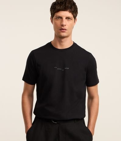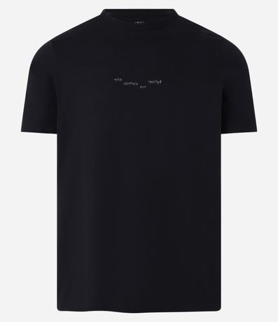 Ref: Camiseta masculina confeccionada em algodão mais sustentável com gola redonda, manga curta e estampa lettering com a frase Who controls our reality?