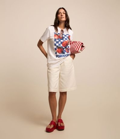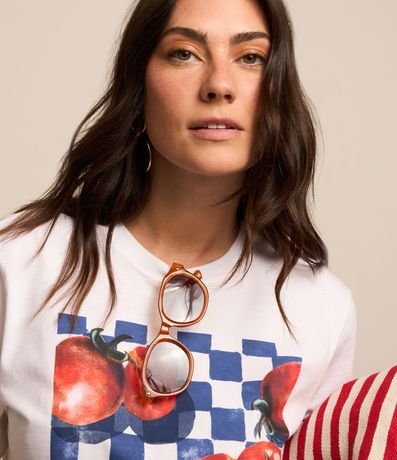 Camiseta t-shirt confeccionada em algodão com manags curtas, gola e redonda e estampa com bloco de cor xadrez com tomates e lettering "pomodoro" logo abaixo.