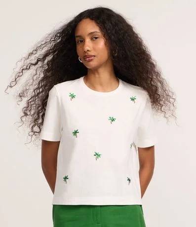 Ref: Camiseta feminina em algodão, com visual despojado. A estampa em paetê bordado de coqueiro. Produzida com processo mais sustentável: Boas Práticas Ambientais e algodão BCI, que apoia práticas sustentáveis.