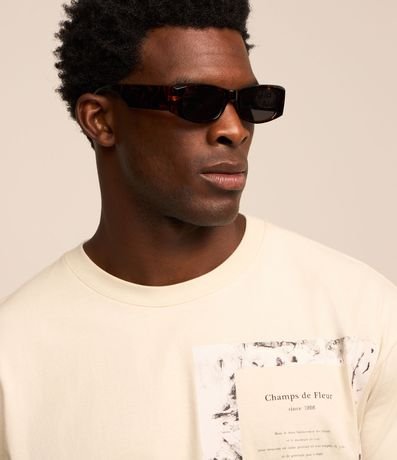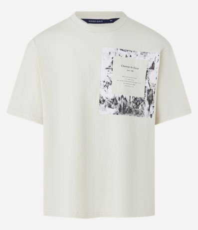 Ref: Camiseta masculina, gola redonda, manga curta, confeccionada em algodão. Peça com estampa localizada de fotografia e um cartão.