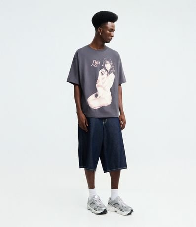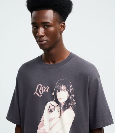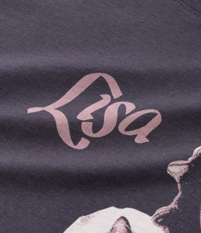 Ref: Camiseta masculina em confeccionada em algodão mais sustentável com boas práticas ambientais, com gola redonda e manga curta. A peça possui estampa de mulher segurando um gato e nome Lisa.
