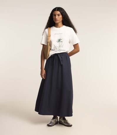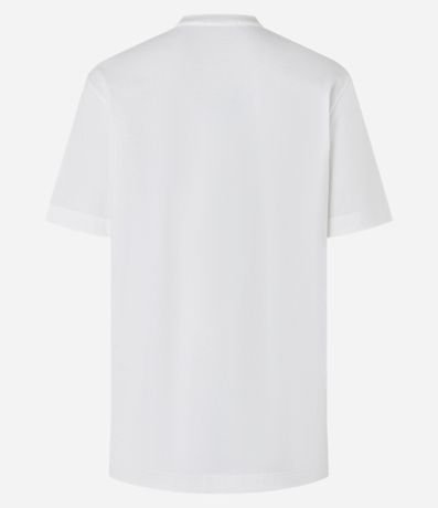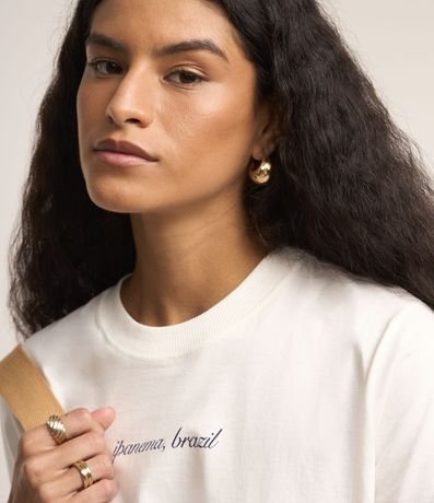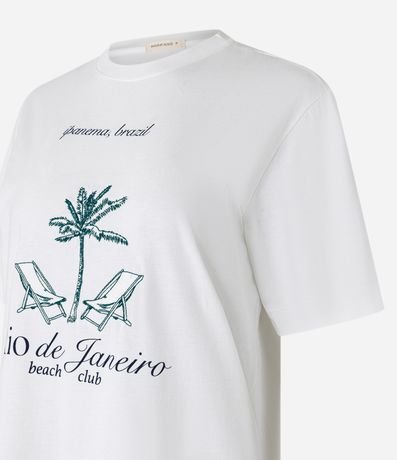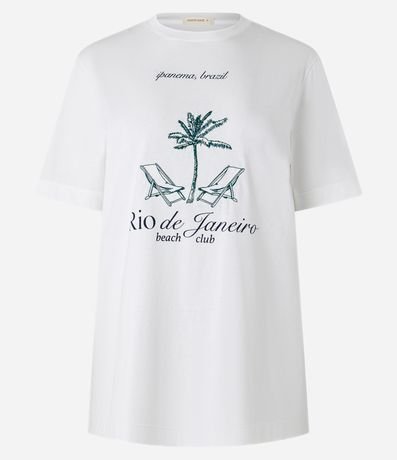 Ref: Camiseta manga curta confeccionada em algodão, com gola redonda e estampa frontal de cadeiras de praia e palmeira, com lettering "Rio de Janeiro beach club".