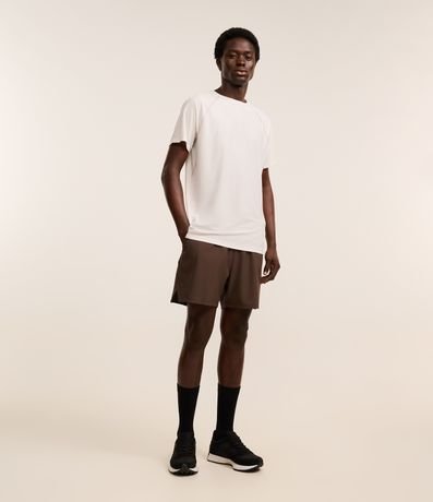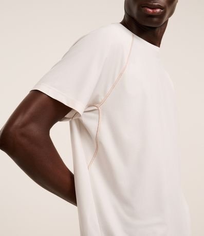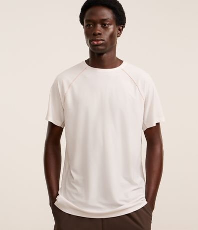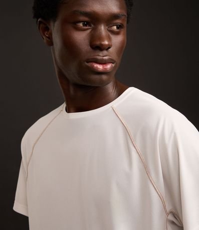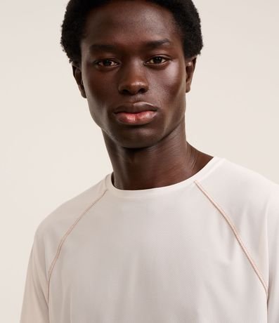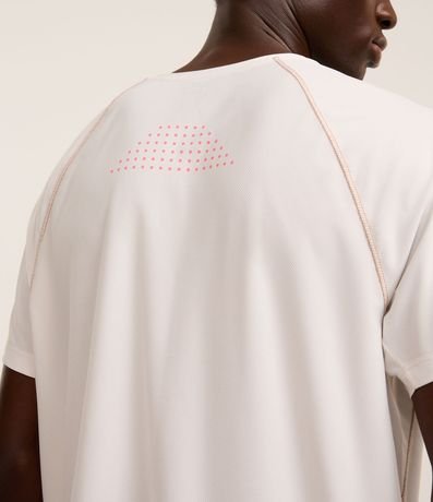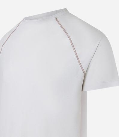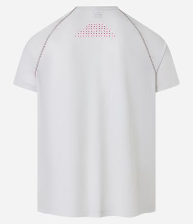 Camiseta masculina confeccionada em tecnologia dry com boas práticas ambientais. A peça possui gola redonda, estampa localizada, costura contrastante e manga curta.