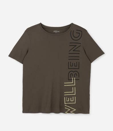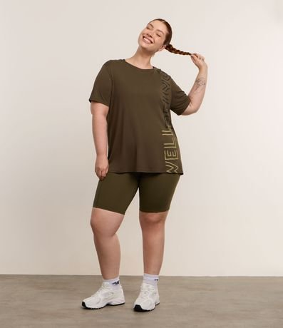 Ref: Camiseta feminina Curve & Plus Size, confeccionada com tecnologia dry, peça esportiva alongada, com gola redonda, manga curta e estampa lettering Well Being.