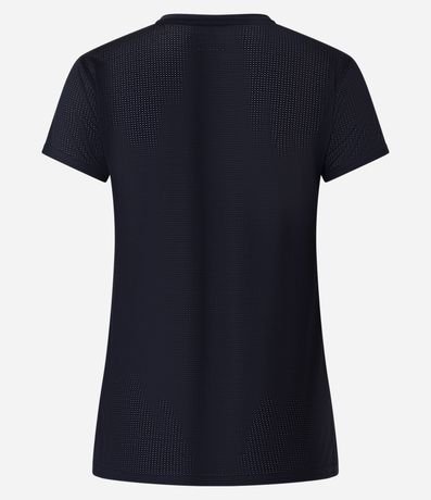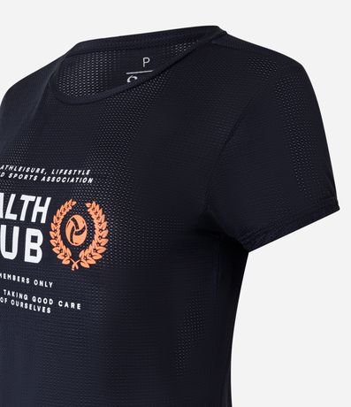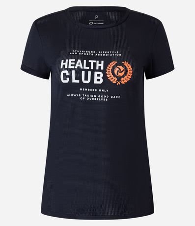 Ref: Camiseta feminina esportiva, confeccionada em malha de Poliamida, com gola redonda e mangas curtas. Possui estampa frontal "Health Club".