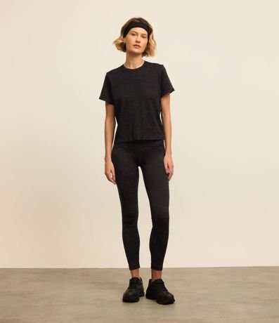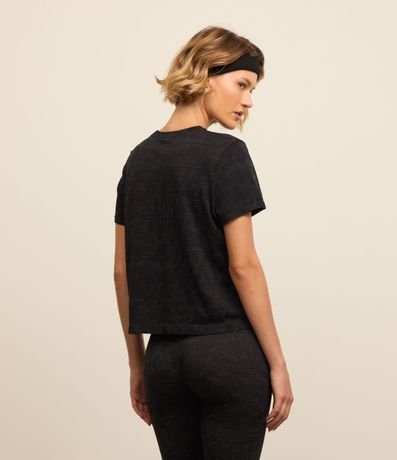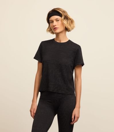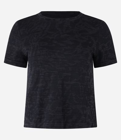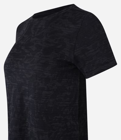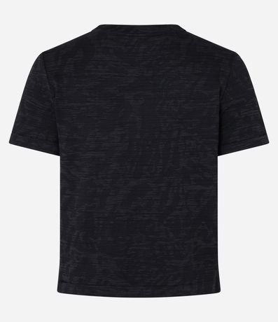 Blusa esportiva com textura de animal print onça. O produto tem gola redonda e mangas curtas.