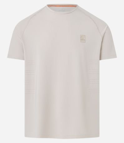 Ref: Camiseta masculina esportiva confeccionada com tecnologia dry, no modelo regular, possui gola redonda, manga curta e estampa localizada.