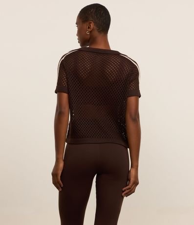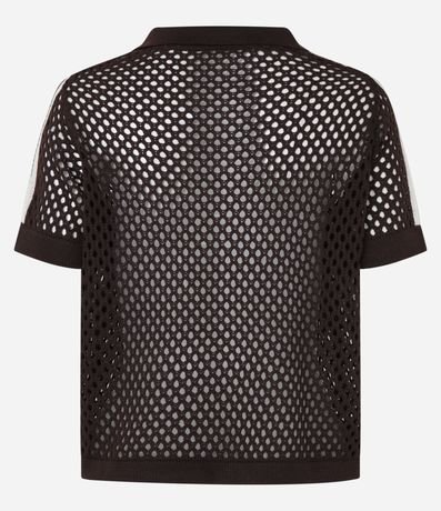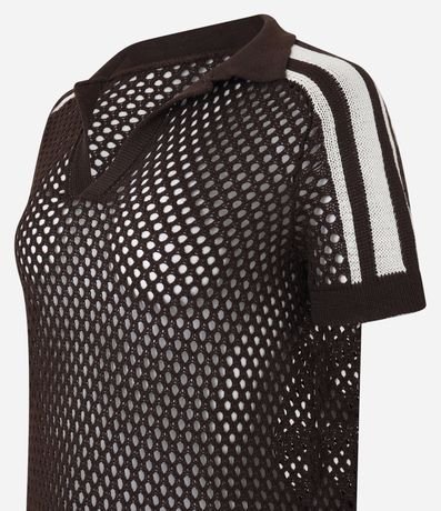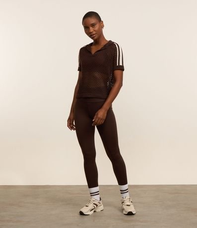 Ref: Camiseta esportiva feminina, confeccionada em tricô leve, com gola polo e mangas curtas. Sem estampa, possui textura de furinhos com pontos abertos, transparência e detalhes de listras no ombro.