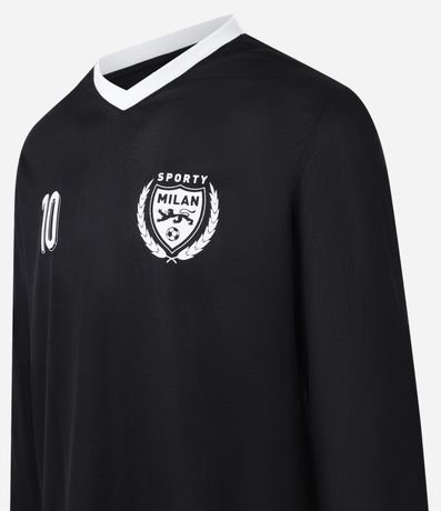 Camiseta masculina confeccionada em tecnologia dry, com gola em v, manga longa e barra contrastantes. Peça no modelo esportiva de futebol com estampa lettering e brasão localizado.