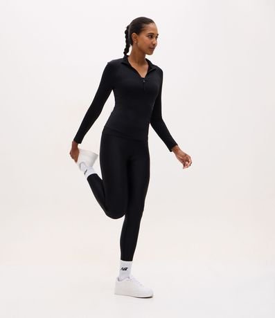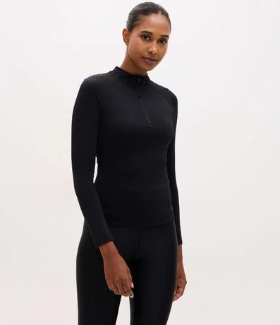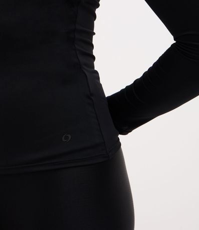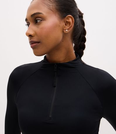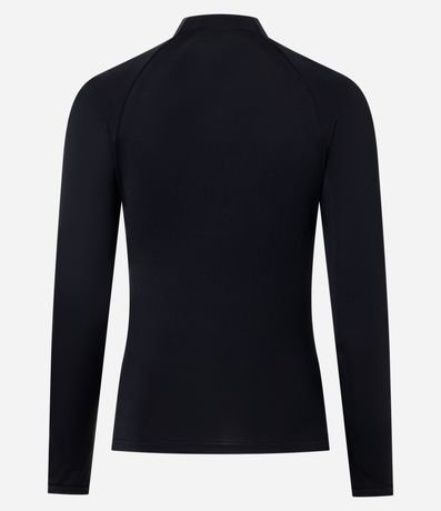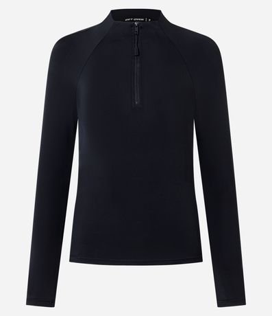 Camiseta esportiva de manga longa feminina, com modelagem ajustada, gola alta com meio zíper frontal. Confeccionada em tecido microfibra de alta elasticidade. Ideal para treinos e atividades esportivas.
