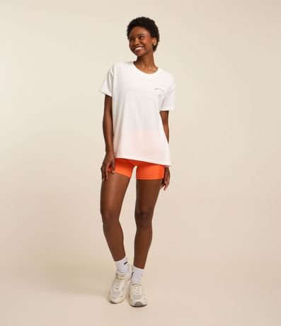 Camiseta feminina esportiva, confeccionada em malha de algodão, com gola redonda e mangas curtas. Possui estampa frontal e nas costas "social club".