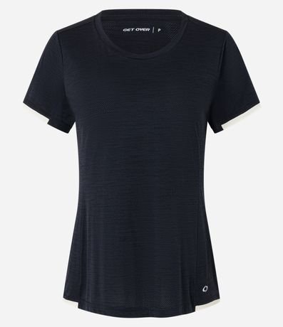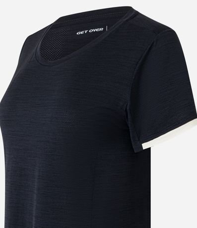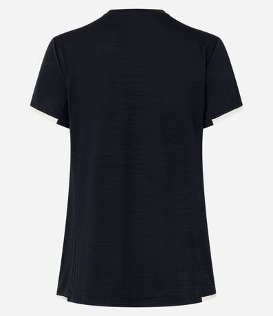 Ref: Camiseta feminina confeccionada em microfibra com boas práticas ambientais, peça com gola redonda, manga curta e detalhe de recortes contrastantes.