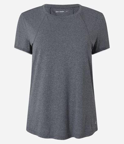 Camiseta feminina confeccionada em microfibra leve com boas práticas ambientais, peça no modelo esportiva com gola redonda, manga curta e detalhe de frisos contrastantes nas costas.