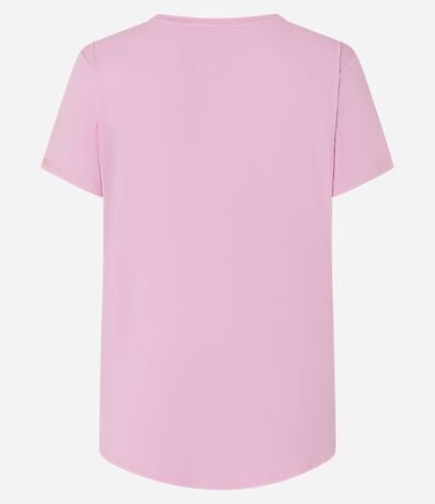 Blusa esportiva confeccionada em microfibra seguindo boas práticas ambientais. A peça tem gola redonda, mangas curtas, estampa no peito e superfície furadinha. Ademais, a barra fraldada se caracteriza por formato mais arredondado, que confere um caimento mais soltinho e fluido.