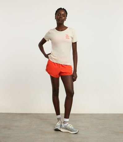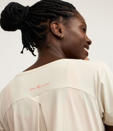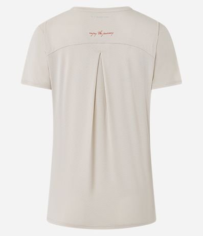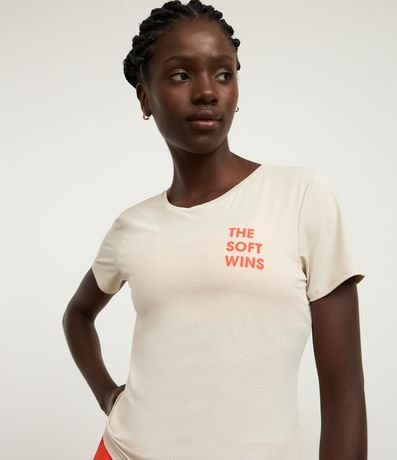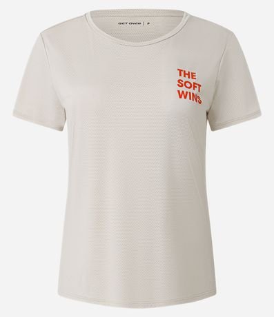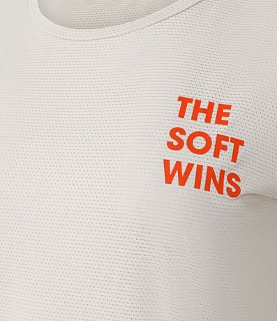 Ref: Camiseta feminina esportiva confeccionada através de boas práticas ambientais. Possui gola u, mangas curtas, estampa frontal "the soft wins", as costas contam com uma prega central dando movimento a peça e detalhe nas costas em lettering "enjoy the journey".