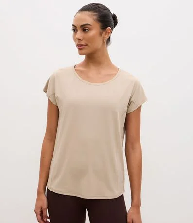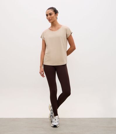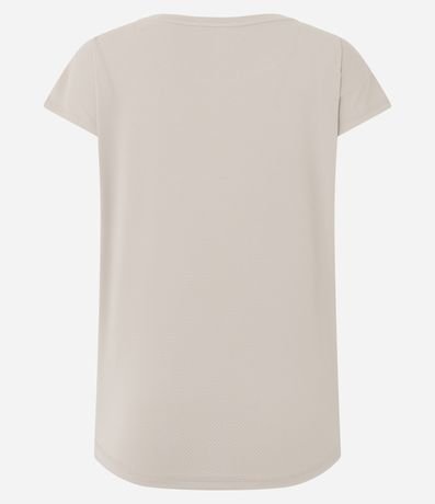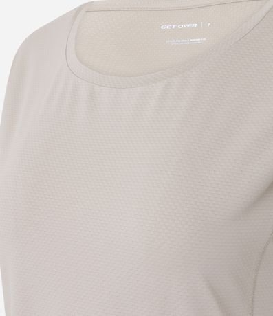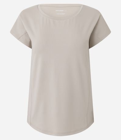 Camiseta esportiva confeccionada em microfibra texturizada. A blusa tem mangas curtas e recorte nas laterais.