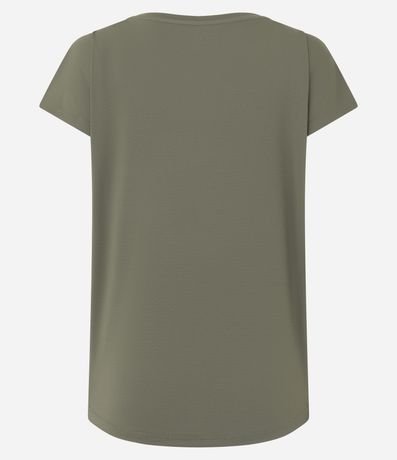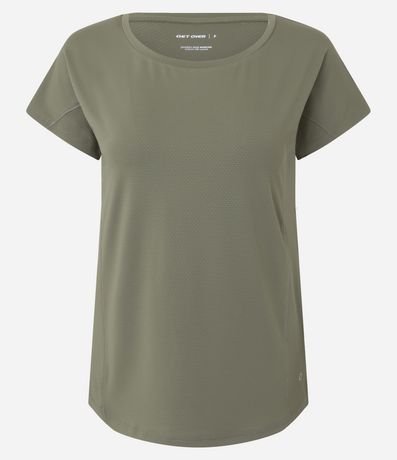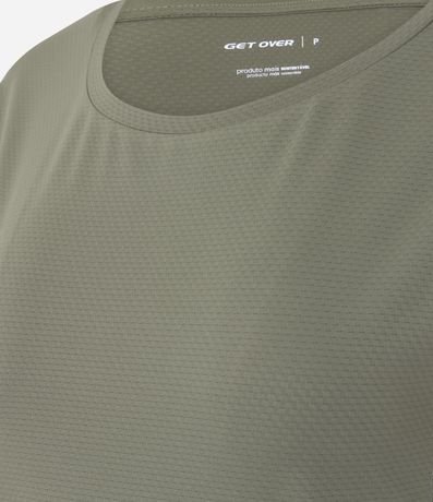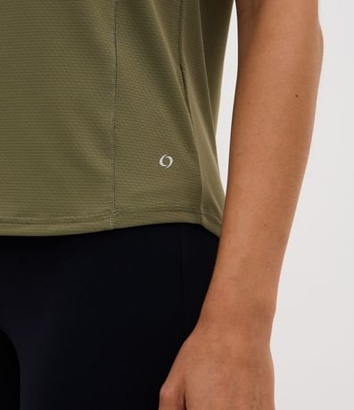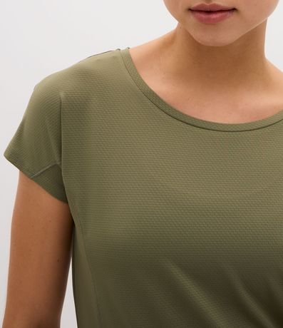 Camiseta esportiva confeccionada em microfibra texturizada. A blusa tem mangas curtas e recorte nas laterais.