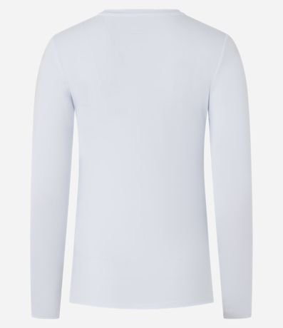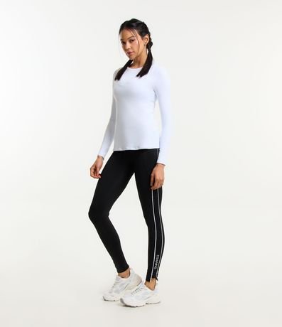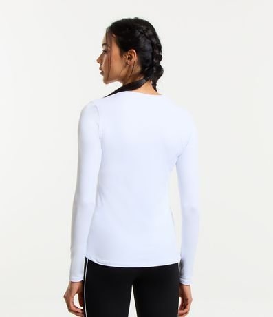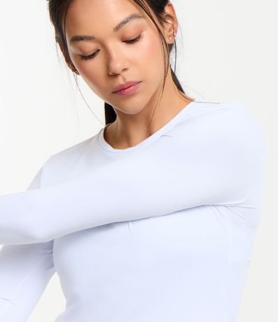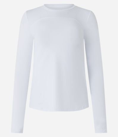 Ref: Camiseta esportiva feminina, confeccionada em poliamida, com proteção UV, mangas longas e cava raglan.