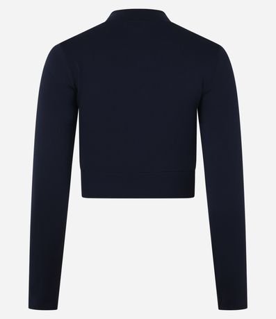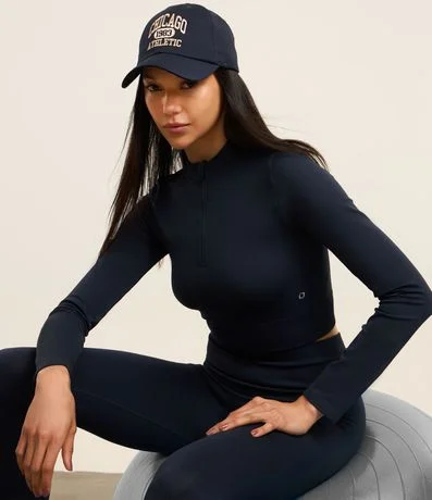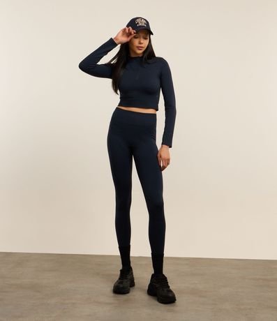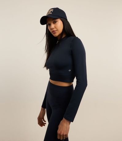 Ref: Blusa esportiva confeccionada em poliamida com acabamento seamless e canelada. A peça tem golinha alta, meio zíper, mangas longas, barra canelada e textura diferenciada sob o busto.