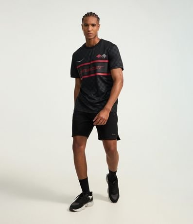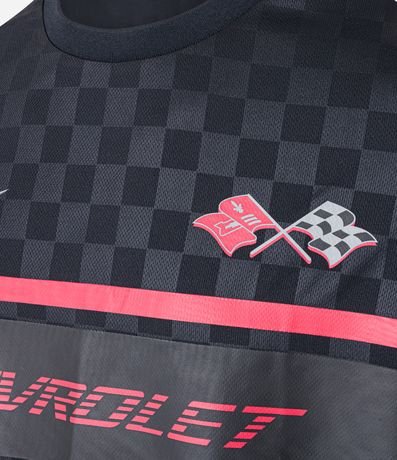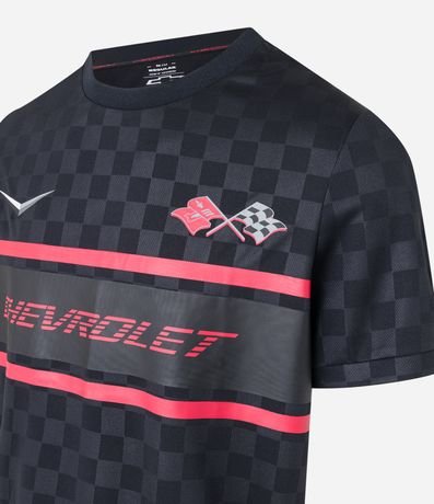 Ref: Camiseta masculina esportiva com gola redonda, manga curta com detalhes contrastantes, estampa de bandeiras Chevrolet. Produto confeccionado com tecnologia dry.