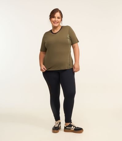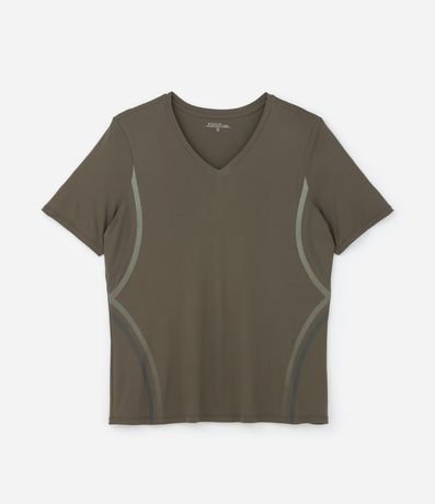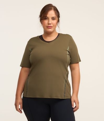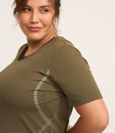 Camiseta feminina Curve & Plus Size, no modelo esportiva confeccionada em tecnologia dry, gola em v com detalhe de segunda pele, listras laterais e manga curta.