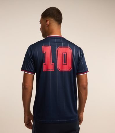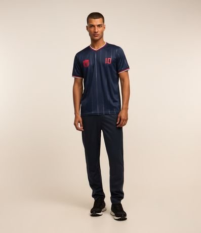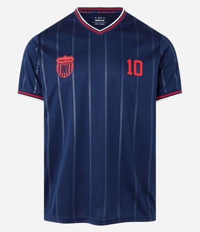 Camiseta esportiva masculina em tecnologia dry, no modelo futebol, gola em v com listras, manga curta com listras, listras finas verticais contrastantes e estampa sport club número 10.