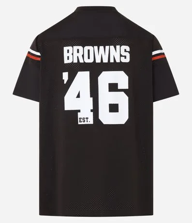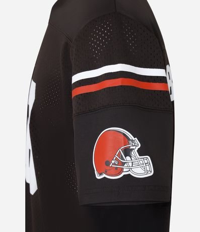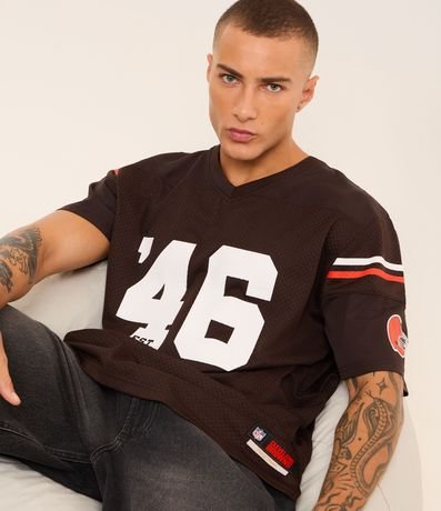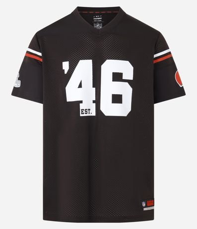 Ref: Camiseta masculina confeccionada em tecnologia dry com furinhos que permite maior respirabilidade para o corpo. Peça no modelo esportivo com gola em v, manga curta com detalhes contrastantes e estampa lettering da liga NFL Browns.