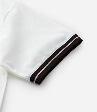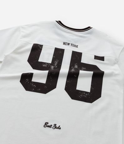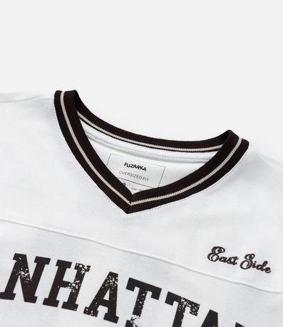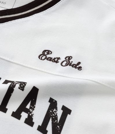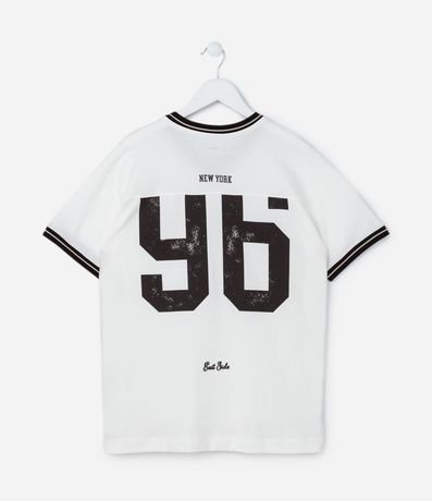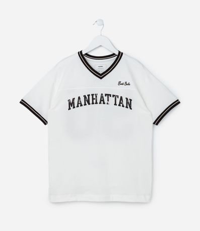 Ref: Camiseta infantil de modelo esportivo, confeccionada em piquet de material mais sustentável. Possui gola V, mangas curtas, lettering frente e costas "Manhattan" e "96", com detalhes de viés contrastante na gola e barra das mangas.