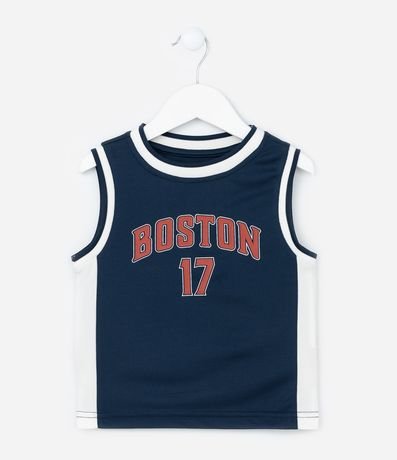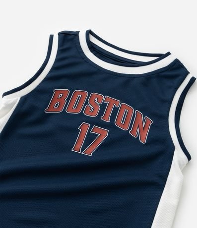Ref: Camiseta infantil, estilo basquete, confeccionada em microfibra leve e estampa lettering "Boston 17".