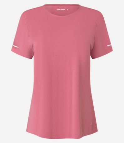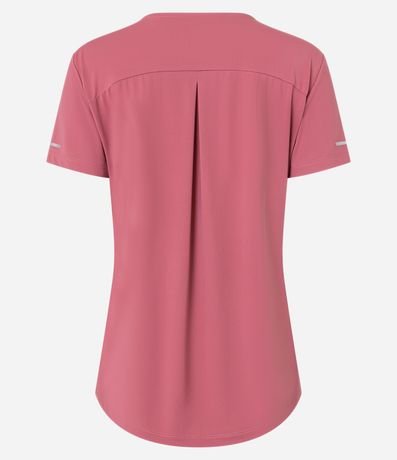 Camiseta esportiva texturizada, com gola redonda, manga curta, detalhe refletivo e prega nas costas.