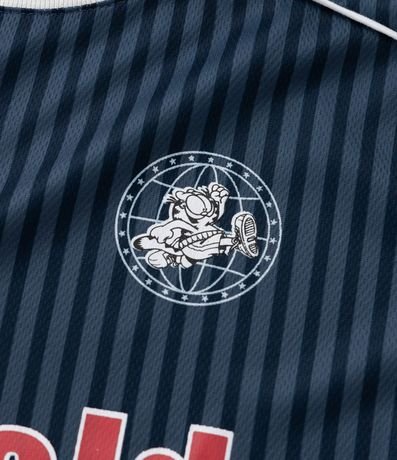 Camiseta infantil de modelo esportiva relaxed, com gola redonda, manga curta e estampa do Garfield com fundo listrado, lettering nas costas "78" e detalhes de frisos contrastantes nos ombros.