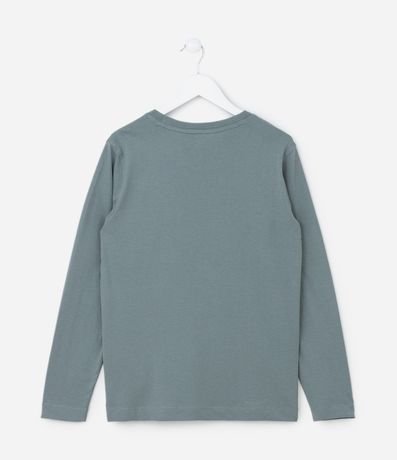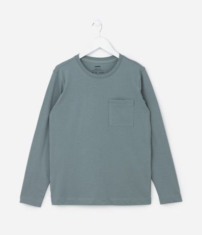 Camiseta infantil confeccionada em algodão, básica, com gola redonda, mangas longas e bolsinho no peito.