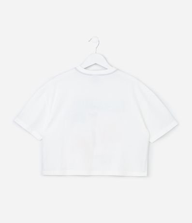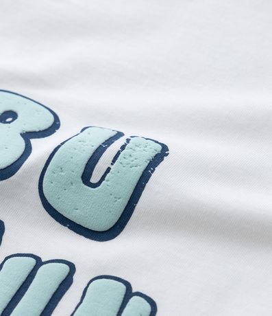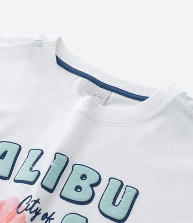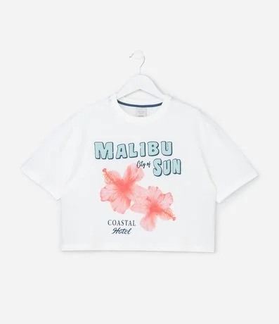 Ref: Camiseta infantil confeccionada em algodão mais sustentável através de boas práticas ambientais, no modelo boxy. Possui gola redonda, manga curta, estampa de flores e lettering "Malibu Sun".