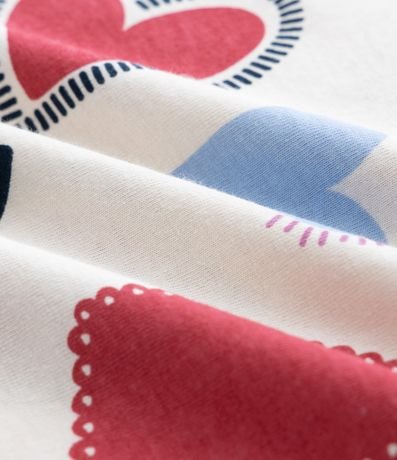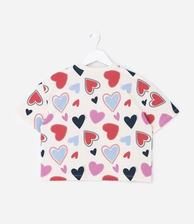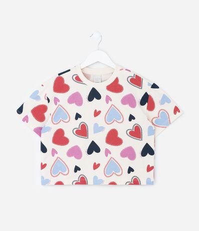 Ref: Camiseta infantil boxy curta confeccionada em algodão certificado BCI e boas práticas ambientais. Possui gola redonda retilínea, manga curta e estampa fullprint de corações coloridos.
