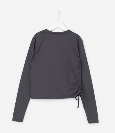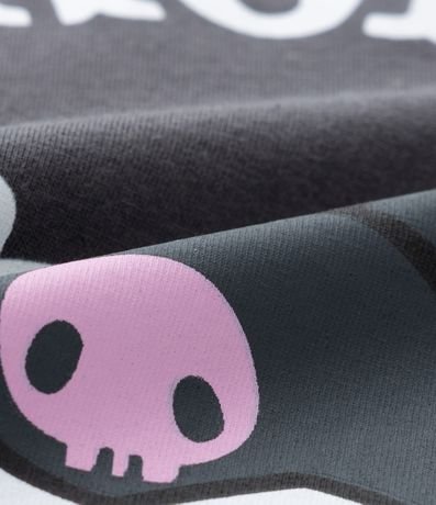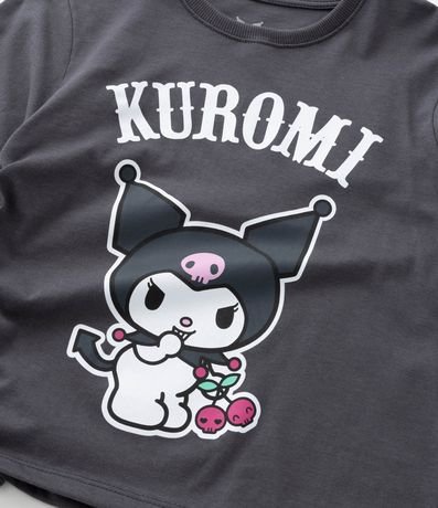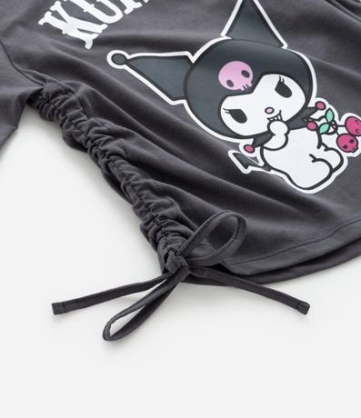 Ref: Camiseta infantil com gola redonda, mangas longas e estampa da Kuromi, com detalhe na lateral de amarração e ajuste. A peça é confeccionada com boas práticas ambientais e algodão certificado bci.