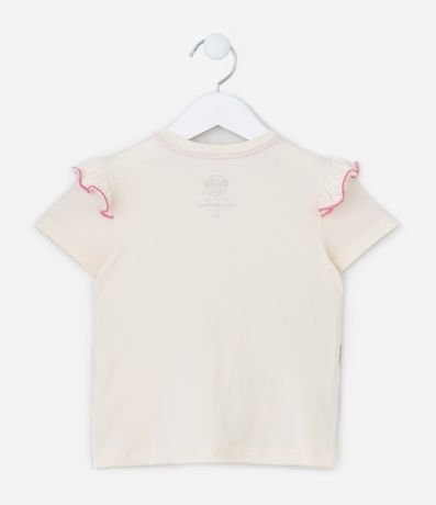 Ref: Camiseta infantil confeccionada em algodão certificado mais sustentável, com gola redonda, mangas curtas com babadinhos nos ombros e estampa da Skye, da Patrulha Canina.