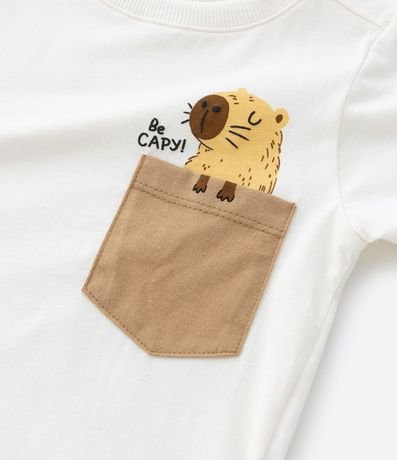 Ref: Camiseta infantil em algodão, com golinha redonda, manga curta e bolsinho no peito com capivara e lettering.