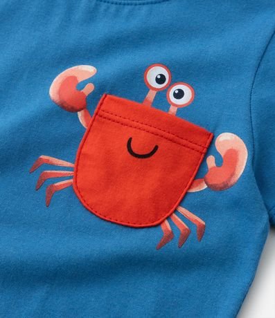 Ref: Camiseta infantil em algodão, com golinha redonda, manga curta e bolsinho no peito com estampa interativa de caranguejo.