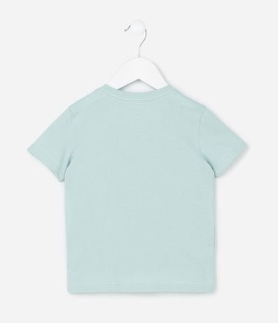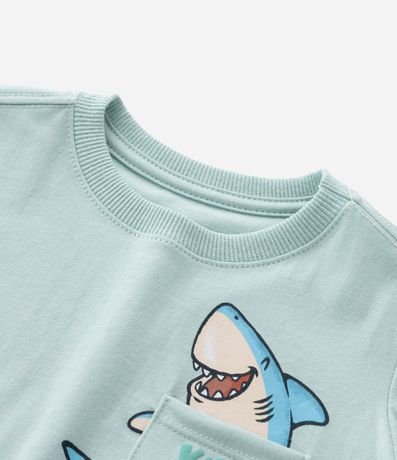 Camiseta infantil confeccionada em algodão mais sustentável através de boas práticas ambientais. Possui gola redonda, manga curta e bolsinho com estampa de tubarão.
