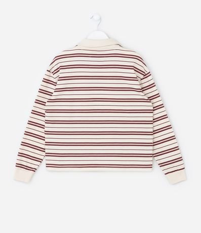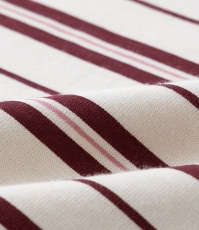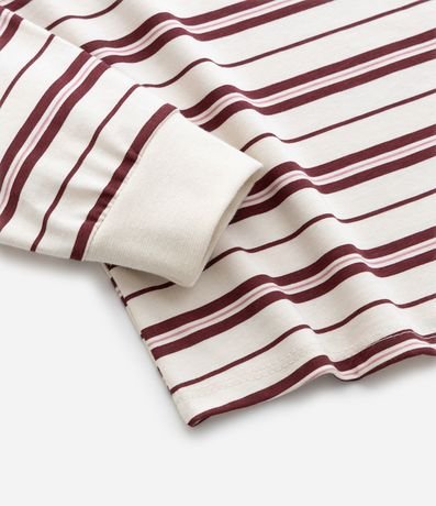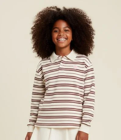 Ref: Camiseta infantil confeccionada em algodão de material e processo mais sustentáveis. Possui gola polo, manga longa, bordado de coração e estampa listrada.