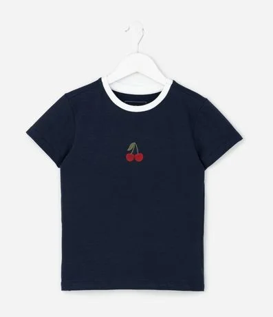 Ref: Camiseta infantil modelo baby look, confeccionada em algodão certificado BCI. Possui gola redonda contrastante, mangas curtas e bordado frontal de cerejas, com estrutura que oferece toque agradável e acabamento limpo adequado ao uso cotidiano.