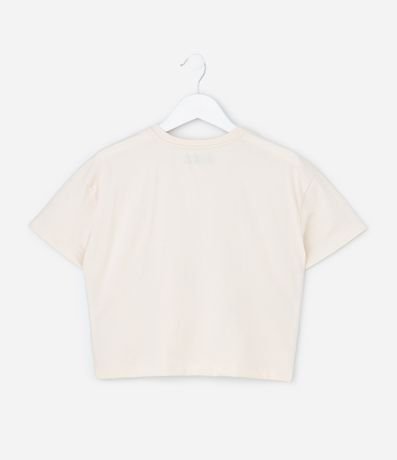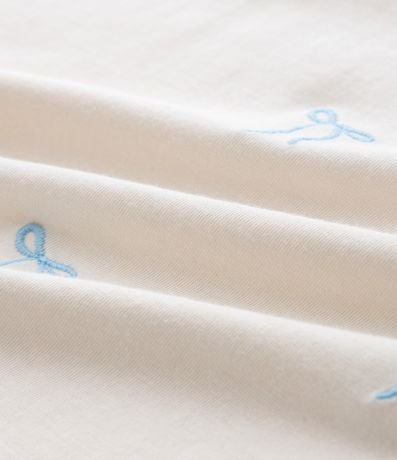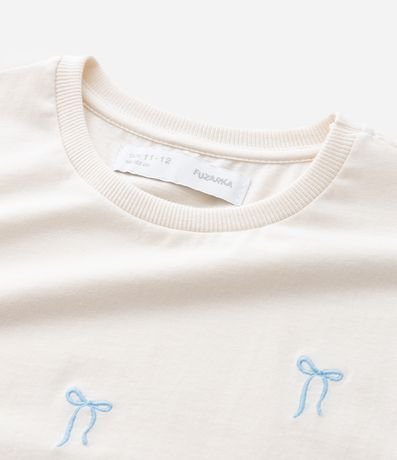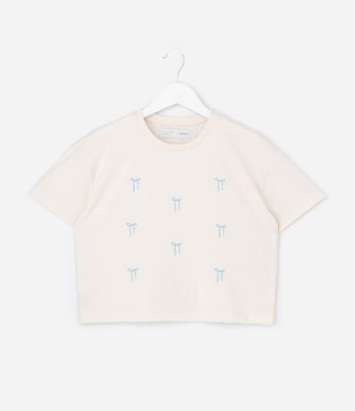 Ref: Camiseta infantil confeccionada em algodão certificado BCI, com gola redonda e mangas curtas. Possui modelo boxy, bordados localizados de pequenos laços, trazendo um visual delicado e confortável no dia a dia.