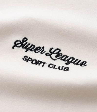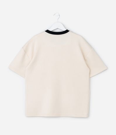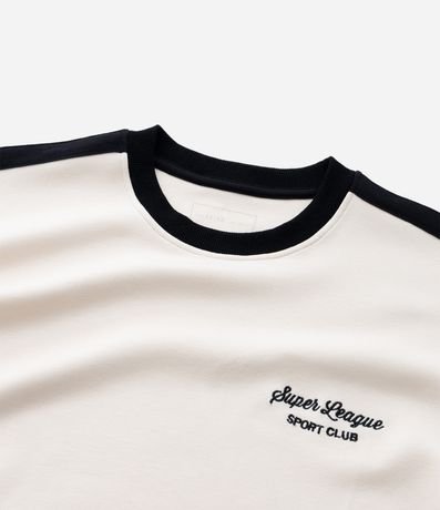 Camiseta infantil confeccionada em meia malha com modelagem regular e gola redonda contrastante. Possui listra aplicado nos ombros e mangas, além de bordado frontal em estilo esportivo que valoriza o visual. Material mais sustentável: Viscose Certificada.