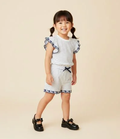 Ref: Camiseta infantil confeccionada em algodão mais sustentável. Possui gola redonda, manga curta, com bordado, frufru e estampa de listras.